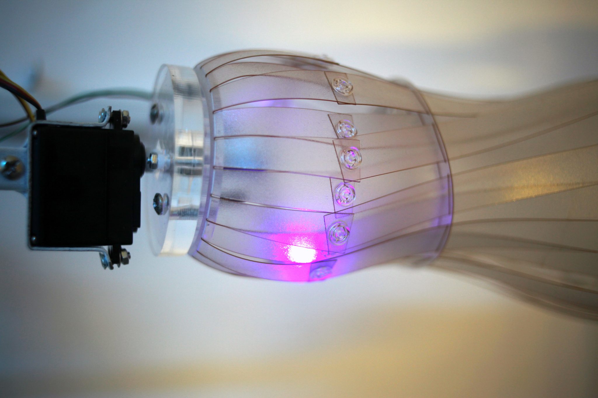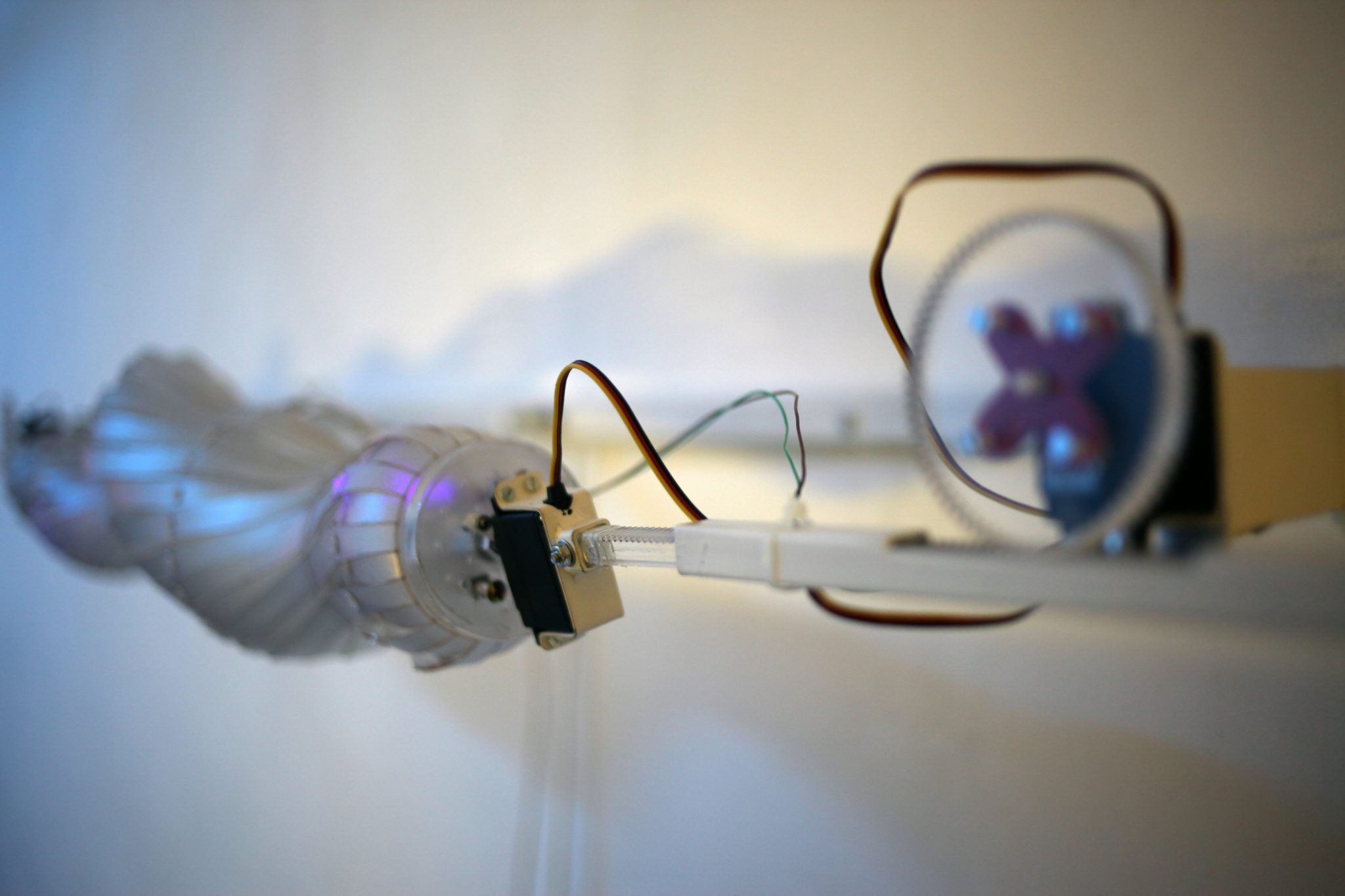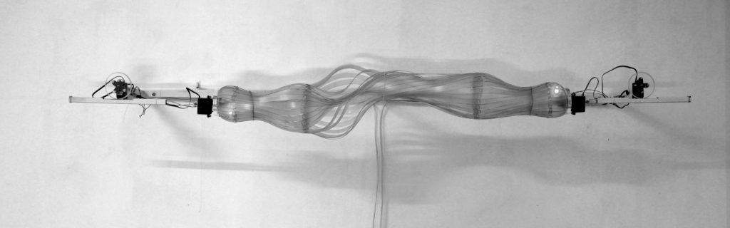 As an analogy to human’s perception of stimuli that makes him react with a complex system of nerve endings, the user through the installation “produces” stimuli that cause reaction of a mechanism that simulates the human muscles. The installation uses a simple cylindrical form which consists of several stripes -as an The installation uses a simple cylindrical form which consists of several stripes -as an analogy to human’s nerves. In the digital world the simulation investigates the form as a free mesh with multiple control points, giving the opportunity of moving/transforming it in real time, presumed upon the new technology of leap motion. In the physical world the user can control it by two different points with his hands, using the arduino board and 4 servos in order to control variables such as distance, rotation and speed.