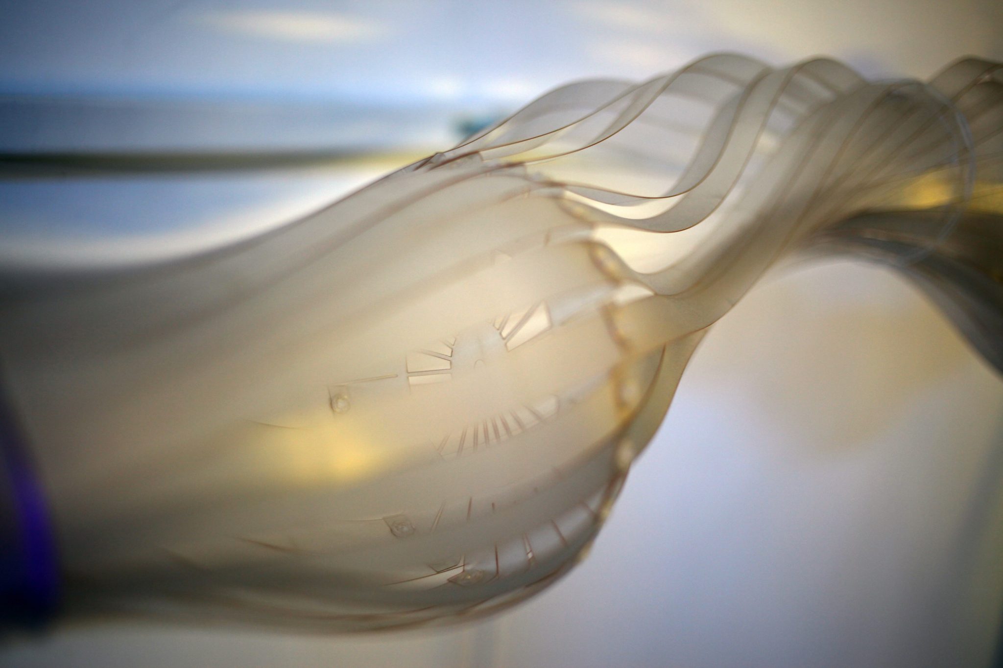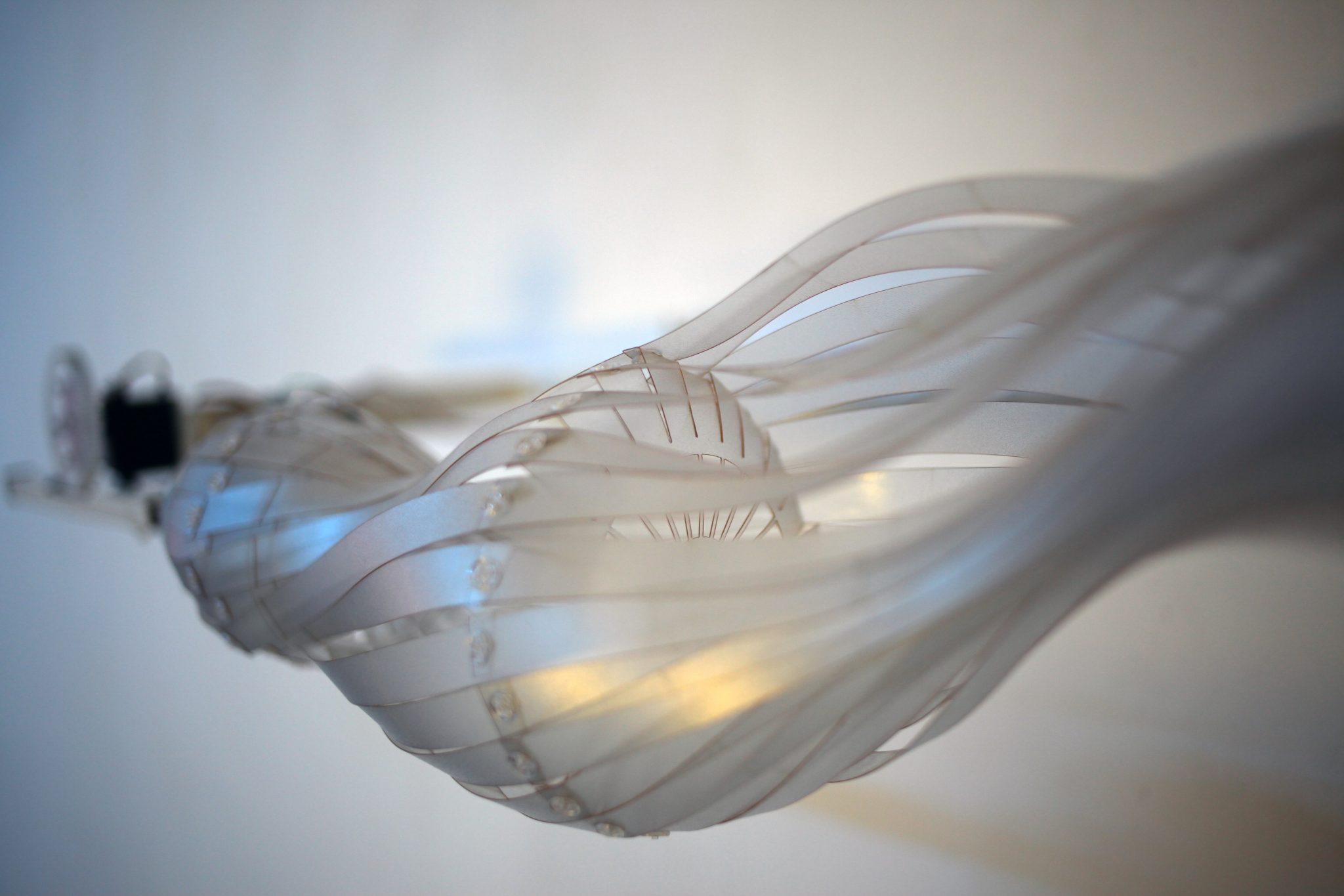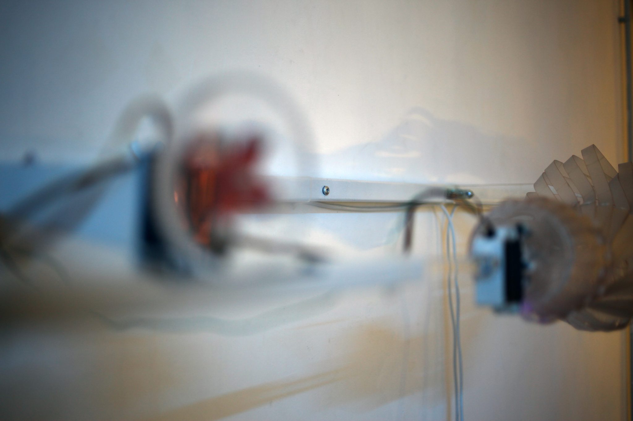 As an analogy to human’s perception of stimuli that makes him react with a complex system of nerve endings, the user through the installation “produces” stimuli that cause reaction of a mechanism that simulates the human muscles. The installation uses a simple cylindrical form which consists of several stripes -as an The installation uses a simple cylindrical form which consists of several stripes -as an analogy to human’s nerves. In the digital world the simulation investigates the form as a free mesh with multiple control points, giving the opportunity of moving/transforming it in real time, presumed upon the new technology of leap motion. In the physical world the user can control it by two different points with his hands, using the arduino board and 4 servos in order to control variables such as distance, rotation and speed.